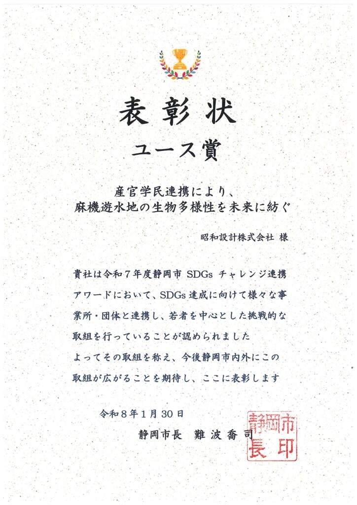 この度、弊社が参画する「麻機遊水地ネイチャーポジティブ産官学民連携チーム」の取組が、令和7年度 静岡市SDGsチャレンジ連携アワードにおいて、「ユース賞」を受賞いたしました 。